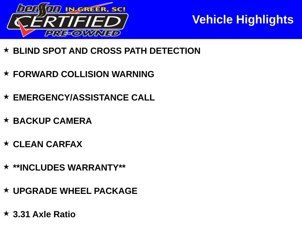 PRICED BELOW J.D.POWER RETAIL PRICE OF $41,625. BLIND SPOT AND CROSS PATH DETECTION, FORWARD COLLISION WARNING, EMERGENCY/ASSISTANCE CALL, BACKUP CAMERA, CLEAN CARFAX, **INCLUDES WARRANTY**, UPGRADE WHEEL PACKAGE, 4WD, 3.31 Axle Ratio.